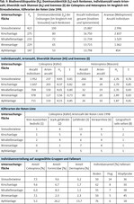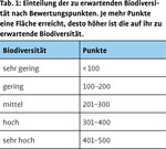 Um die Wirkung der verschiedenen unter Kap. 3.3 genannten Einflussfaktoren vergleichbar zu machen, ist es erforderlich, diese zu bewerten und einzuteilen. Hierfür wurden ein gewichteter Bewertungskatalog und auf dessen Grundlage ein Bewertungsbogen (siehe Tab 1A im Online-Supplement, abrufbar unter Webcode NuL2231 ) zur Erfassung der Einflussfaktoren erstellt. Über die vergebenen Punkte lässt sich eine Aussage über die wahrscheinlich vorhandene Biodiversität auf der Fläche und deren mögliche Aufwertung machen. Die Einordnung der Punkte erfolgt in fünf Stufen nach der zu erwartenden Biodiversität (Tab. 1). Der maximal zu erreichende Punktwert je Einflussfaktor wurde in dieser Arbeit mit 100 Punkten festgelegt. Insgesamt können so höchstens 500 Punkte erreicht werden.