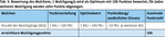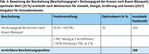 Der Beschattungsgrad (Tab. 4) wurde über den Deckungsgrad der Kronen nach Braun-Blanquet (Willmanns1998) (Deckungsgrad Beschattungsgrad) ermittelt. Für die Bewertung wurde der durchschnittliche Beschattungswert von Streuobstwiesen (durchschnittliche Kronengröße, Baumdichte nach Ministerium für Umwelt, Energie, Ernährung und Forsten 2017) als optimaler Wert bei 35 % mit 100 Punkten angesetzt. Bei stärkerer oder geringerer Beschattung wird jeweils ein Punkt je % Beschattungsdifferenz vom optimalen Wert abgezogen. Besonders starke Beschattung (> 50 %) wird doppelt gewertet, da eine große Kronendichte zu langsamem Abtrocknen der Blätter führt.