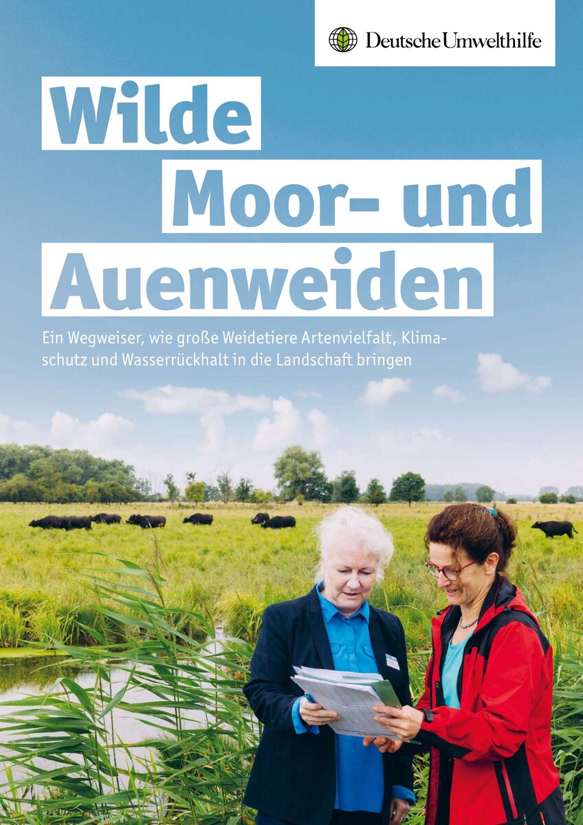 Die Fachbroschüre „Wilde Moor- und Auenweiden – Ein Wegweiser, wie große Weidetiere Artenvielfalt, Klimaschutz und Wasserrückhalt in die Landschaft bringen“ der Deutschen Umwelthilfe e.V. ist ein Praxisleitfaden für Fachbehörden und Entscheidungstragende zur Umsetzung von Renaturierungsprojekten mit Beweidung in Auen und Mooren.