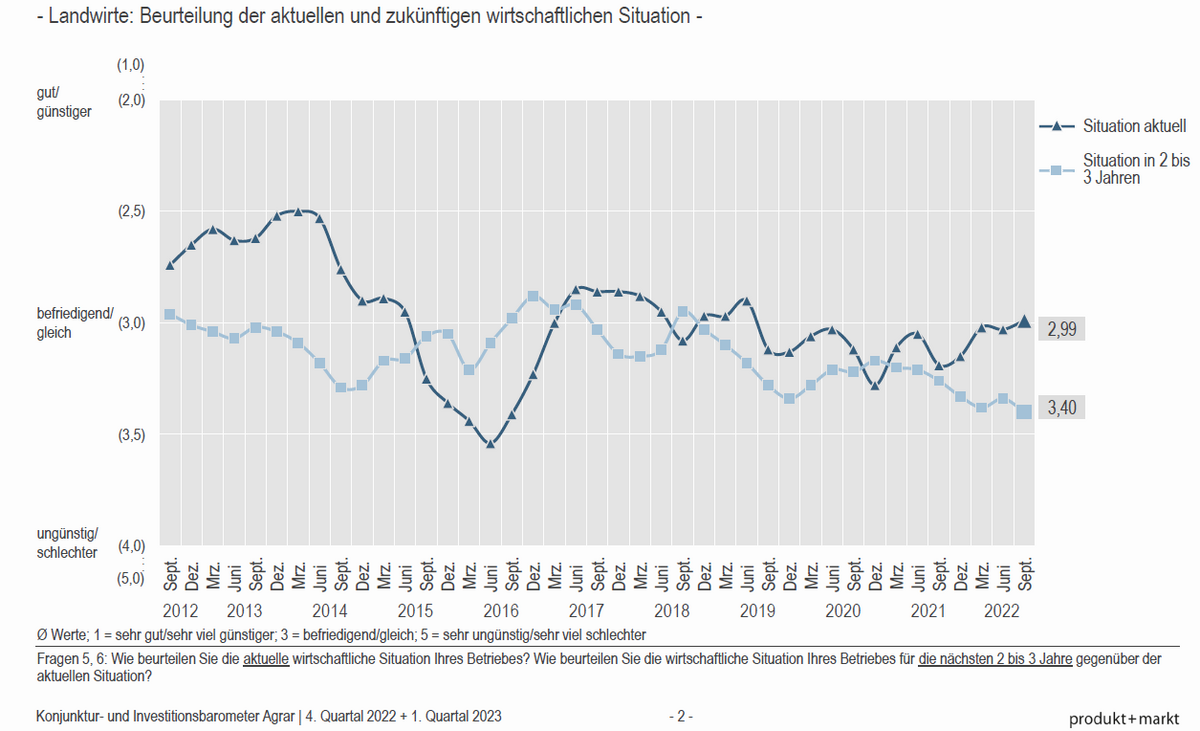 Auf der Notenskala von 1 bis 5 wird die aktuelle wirtschaftliche Situation im Durchschnitt der Betriebe mit 2,99 deutlich günstiger beurteilt als die zukünftigen Aussichten mit einem Wert von 3,4. Die aktuelle wirtschaftliche Lage hat sich gegenüber Juni in den Veredlungsbetrieben deutlich verbessert. In den Ackerbaubetrieben hat sich die Einschätzung gegenüber Sommer dagegen kaum verändert. Unter den Betriebsformen wird die aktuelle wirtschaftliche Situation am besten von den Futterbaubetrieben beurteilt.