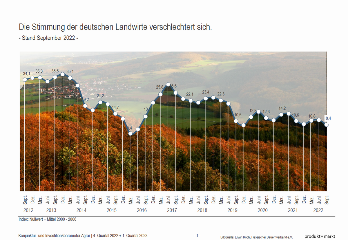 Stark gestiegen sind indes die Investitionsabsichten in erneuerbare Energien. Investiert wird laut Konjunkturbarometer vor allem in Photovoltaikanlagen, darunter auch in Freiflächen- und Agri-PV-Anlagen. Der Anteil der Landwirte, der im nächsten halben Jahr insgesamt investieren will, liegt bei 34 %, gegenüber 30 % im Vorjahr. Das dabei geplante Investitionsvolumen wird auf 5,7 Mrd. Euro veranschlagt. Grund für die Steigerung sind erheblich höhere Investitionen in erneuerbare Energien mit einem Plus von 1,4 Mrd. Euro.