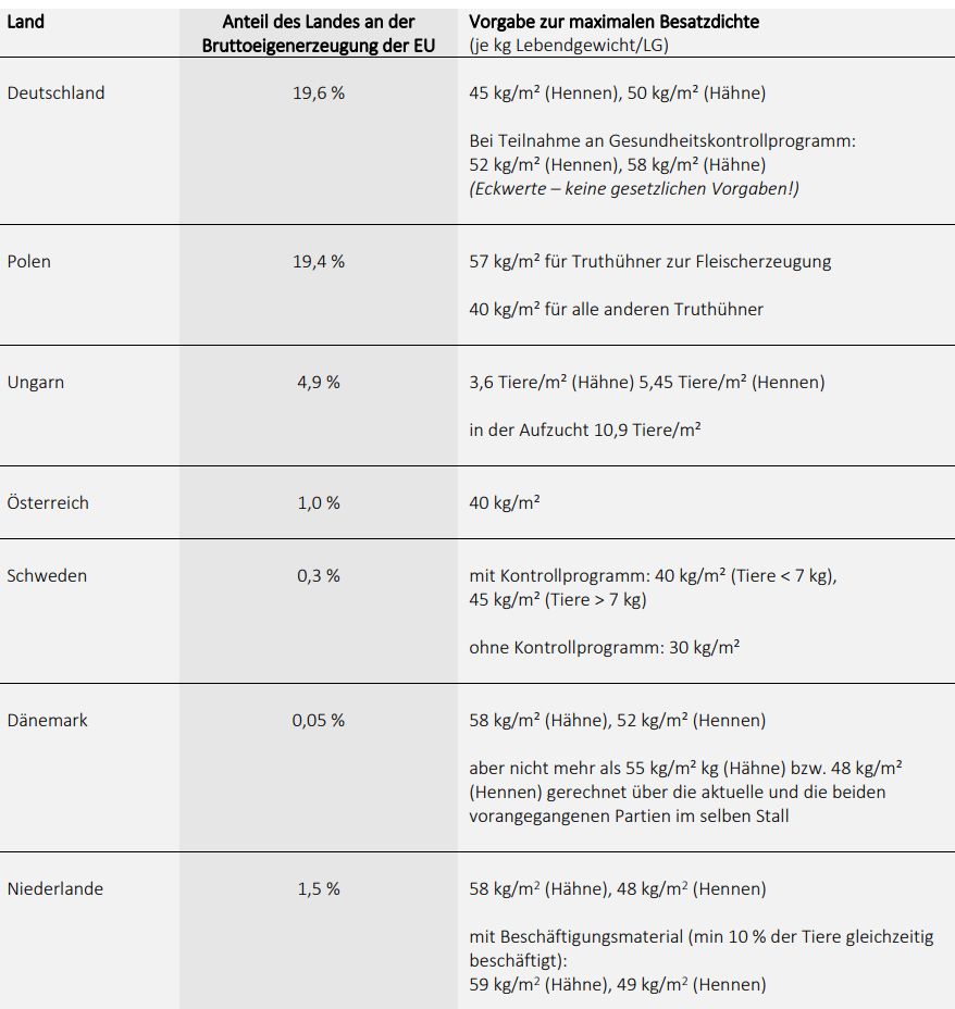 Wie die Autoren in der Studie feststellten, zeigt Österreich bezogen auf die Besatzdichte mit 40 kg LG/m2 in allen Haltungsphasen die strengsten Vorgaben, während die Niederlande mit 59 kg LG/m2 für männliche Tiere (bei Einsatz von Beschäftigungsmaterial) die höchsten Besatzdichten vorgibt. Von den sechs EU-Ländern (Deutschland, Polen, Frankreich, Italien, Spanien, Ungarn), welche laut MEG für rund 90 % der Erzeugung von Putenfleisch in der EU aufkommen, besitzen nur Polen und seit dem 1. Januar 2023 auch Ungarn Vorgaben zur Besatzdichte.