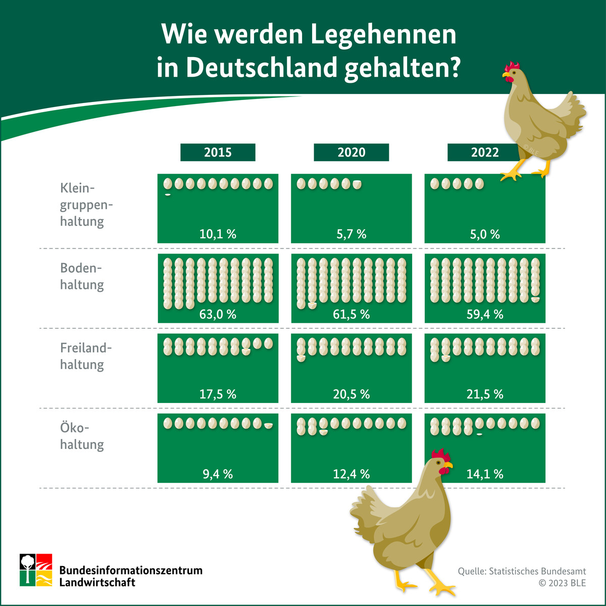 Die häufigste Haltungsform für Legehennen ist in Deutschland war 2022 die Bodenhaltung; rund 60 Prozent der Legehennen werden so gehalten. Zuletzt ist der Anteil jedoch leicht gesunken, während die Freiland- und die Ökohaltung zugenommen haben. Inzwischen wird fast jede siebte Legehenne nach Öko-Richtlinien gehalten. Die Haltung in Kleingruppen ist mittlerweile verboten, für bestehende Einrichtungen gilt eine Auslauffrist bis 2025. Aktuell werden noch fünf Prozent der Legehennen in Kleingruppen gehalten. 2015 war ihr Anteil noch mehr als doppelt so groß. In der Statistik werden Unternehmen mit mindestens 3.000 Hennenhaltungsplätzen erfasst. Die Zahlen stammen vom Statistischen Bundesamt.
