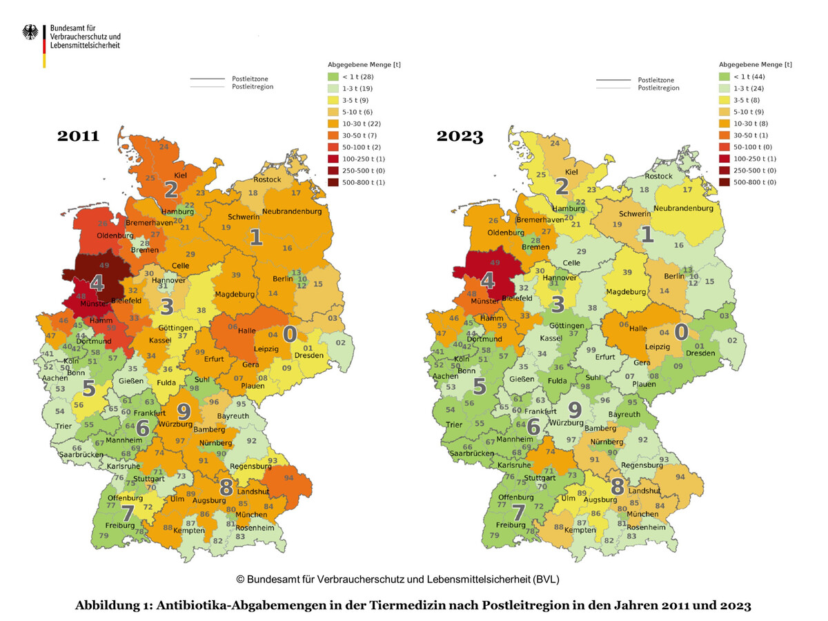Aufgrund gesetzlicher Änderungen werden seit 2023 nicht nur Antibiotika erfasst, die von pharmazeutischen Unternehmen und Großhändlern an Tierärzte abgegeben werden, sondern auch an Apotheken, Veterinärbehörden und Hochschulen. Deshalb sind die Zahlen nur eingeschränkt mit denen der Vorjahre vergleichbar. In der Summe wurden für das Jahr 2023 insgesamt 11,0 Tonnen (-2,1 Prozent) weniger abgegebene antibiotische Tierarzneimittel an das BVL gemeldet als im Jahr 2022. Gegenüber 2011, dem ersten Jahr der Erfassung der Antibiotikaabgabemengen, beträgt der Rückgang 69 Prozent.