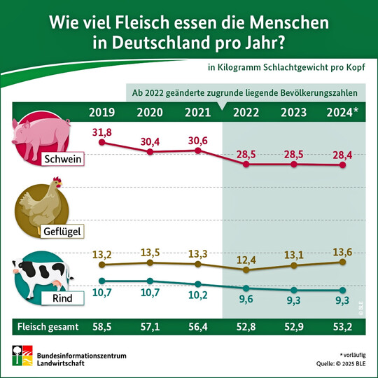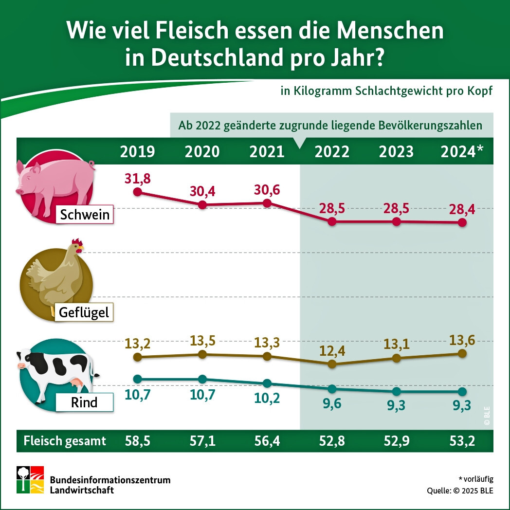 Insgesamt belief sich der Fleischverzehr 2024 auf 4,44 Mio. t, das waren 0,8 % mehr als im Vorjahr. „Wie sich dies weiterentwickelt, bleibt abzuwarten“, sagt Dr. Josef Goos, Leiter des Bundesinformationszentrums Landwirtschaft (BZL). „Eine Rückkehr zu Verzehrmengen früherer Jahre erscheint vor dem Hintergrund des Trends zur flexitarischen Ernährung unwahrscheinlich.“ Aus statistischer Sicht ist zudem zu beachten, dass sich der ausgewiesene rechnerische Fleischverzehr je Kopf ab 2022 auf aktualisierte Bevölkerungszahlen bezieht und derzeit ein Vergleich mit Vorjahren nicht möglich ist. „Sobald die Rückrechnung der Bevölkerungszahlen auf Basis des Zensus 2022 vorliegt, können wir den Pro-Kopf-Verzehr zehn Jahre rückwirkend berechnen und Aussagen zum langfristigen Trend treffen,“ ergänzt Goos.