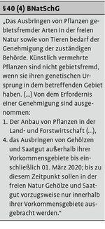 Im Juni 2009 hat der Deutsche Bundestag – trotz erheblichen Widerstands der norddeutschen Baumschulwirtschaft – die Pflicht zur Verwendung gebietsheimischer Pflanzen in der freien Landschaft im Bundesnaturschutzgesetz (BNatSchG) verankert, welches am 01. März 2010 in Kraft tritt (siehe Kasten). Zahlreiche wissenschaftliche Untersuchungen, unter anderem der Bayerischen Landesanstalt für Weinbau und Gartenbau Veitshöchheim (LWG), haben immer wieder die Vorzüge „autochthoner“ Pflanzen gegenüber Standardware beliebiger Herkunft belegt, wenngleich nicht bei allen Arten.