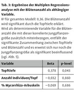 Wenn also die Ressource „Topftiefe“ entscheidend für die Jungpflanzengröße und letztlich für die Blütenanzahl/Pflanze ist, dann muss als wichtiger Ressourcen bestimmender Parameter die Anzahl der Pflanzen je Topf (falls mehre Individuen je Topf gepflanzt waren) bzw. die Anzahl der im Verlauf der Kultur abgestorbenen Pflanzen im jeweiligen Topf in die Analyse miteinbezogen werden. Deshalb wurde eine multiple Regressionsanalyse (MRA, stepforward selection, Ausschlusskriterium 0.05) mit den relevanten determinierenden Variablen „Mycorrhiza-Befall (Arbuskeln in %)“, „Topftiefe“ und der „Anzahl der Individuen/Topf“ sowie den abhängigen Variablen „Blütenanzahl“ und „Jungpflanzengröße“ im Vorjahr durchgeführt. Die Ergebnisse (Tab. 3) zeigen, dass in diesem Modell nur di Topftiefe einen signifikanten positiven Einfluss auf die Blütenanzahl hat. Zieht man in der MRA die Jungpflanzengröße des Vorjahres als erklärende Variable hinzu (die mit der Blütenzahl korreliert, vgl. Abb. 5), so hat nur noch diese einen signifikanten Einfluss auf die Blütenzahl.