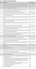 Im Projektverlauf konnten konsensfähige Vorschläge zu einheitlichen Qualitätsstandards erarbeitet werden. Neben einer themenfeldübergreifenden Prüfliste (vgl. Tab. 3) wurden weitere ergänzende Werkzeuge (z.B. Musterdatenblätter, Listen mit Kontrollinhalten und -intervallen, Hinweise für die Durchführung von Bodenkontrollen usw.) erarbeitet.