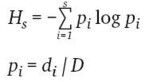 Je größer der Wert HS, desto höher die Strukturvielfalt einer Windwurffläche. S bezeichnet die Gesamtzahl der vorkommenden Strukturtypen. pi stellt den relativen Anteil des Vorkommens eines Strukturtyps (i) an der Gesamtzahl aller Strukturtypen der Fläche dar. Als di wird der absolute Anteil eines Strukturtyps (i) an der Gesamtzahl aller Strukturtypen bezeichnet. D steht für das gesamte Vorkommen aller Strukturtypen einer Fläche.