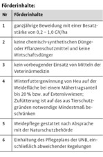 Auch spezielle Inhalte zur Förderung der extensiven Beweidung, wie z.B. die Beweidung extrem steiler oder verbuschter Flächen sowie Entbuschungen als vorbereitende Maßnahmen für die spätere Integration der Flächen in die Agrarumweltmaßnahmen, müssen förderfähig sein. Investitionen in Weidelogistik (Einrichtung von Tränken, Fanggatter, Zaunbau, Weidetore, Bau von Weideunterständen) sollen ebenfalls in diese Förderschiene fallen. Wichtig ist weiterhin, dass die Erstellung von Weidemanagementplänen und die Anschaffung und Haltung bedrohter Weidetierarten und -rassen förderfähig sind.