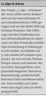 Datenbank mit beispielhaften Klimamaßnahmen: http://www.cipra.org/de/cc.alps/ergebnisse/good-practice . Der vollständige CIPRA compact über Klimawandel und Naturschutz ist unter http://www.cipra.org/de/cc.alps/ergebnisse/compacts zum Download verfügbar.