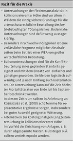 Die Heliumballonmethode ist grundsätzlich für die Konfliktbeurteilung eines geplanten Standorts geeignet. In der Zusammenschau mit dem Kenntnisstand aktueller Studien wird gefolgert, dass lediglich Untersuchungen in kollisionsrelevanten Höhen die Beurteilung des Tötungsrisikos erlauben. Eine solche Beurteilung ist nicht nur wichtig für den Artenschutz, sondern .bezüglich zum Schutze der Fledermäuse geforderter Abschaltzeiten auch wirtschaftlich bedeutsam.