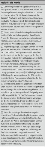 Für das Esparsetten-Widderchen ist sowohl die Habitatqualität als auch die Konnektivität der Flächen entscheidend. Über eine Distanz von bis zu 750 m findet eine Besiedlung der Flächen am wahrscheinlichsten stattfindet. Für die zweite Zielart Pulsatilla vulgaris hingegen, welche über ein geringes Ausbreitungs- und Wiederbesiedlungspotenzial verfügt, ist die zeitliche Kontinuität der Habitate entscheidend. Zusammenfassend belegt die Untersuchung die Notwendigkeit, den räumlichen und zeitlichen Verbund der Standorte mit hoher Habitatqualität zu sichern.