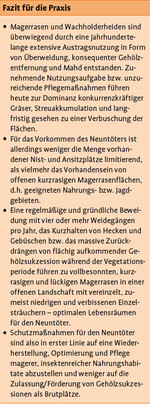 Während in den bereits vorliegenden Managementplänen für Natura-2000-Gebiete in Baden-Württemberg bei den Erhaltungs- und Entwicklungszielen für den Neuntöter stark auf den Erhalt und die Entwicklung von Gehölzen abgestellt wird, zeigt die vorliegende Studie, dass weniger die Menge vorhandener Nist- und Ansitzplätze limitierend für den Neuntöter sind. Viel stärker relvant ist das Vorhandensein von offenen kurzrasigen Magerrasenflächen, d.h. geeigneten Nahrungs- bzw. Jagdgebieten im Habitat.