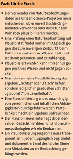 Die Plausibilisierung einzelner Beobachtungen scheint gerade bei Daten aus internetgestützten Citizen-Science-Projekten meist unabdingbar, um die Fehlerquote zu begrenzen und fragwürdige wissenschaftlichen Aussagen zu vermeiden. Problembehaftet beim Plausibilisieren von Naturbeobachtungen wirken insbesondere die Auswahl der Plausibilisierungsmethode sowie die praktische Umsetzung des methodischen Konzepts mit der Notwendigkeit, Wahrscheinlichkeitsgrenzen zu definieren, was noch als plausibel (i. S. von „glaubwürdig“ oder „verlässlich“) gelten soll.