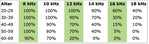 Tab. 1 zeigt deutlich, dass selbst junge Menschen ab 14 kHz nicht immer zuverlässig hören. Mit zunehmendem Alter schwindet diese Fähigkeit zudem deutlich, so dass in der Altersgruppe ab 60 Jahren bereits ab einer Frequenz von 10 kHz erhebliche Lücken auftreten.