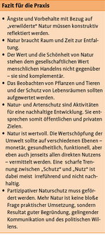 - Naturschutz erfordert praktische und ideelle Maßnahmen, um möglichen Ängsten und Vorbehalten in der Umsetzung durch Vorbilder und Ideen zu begegnen.