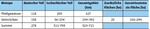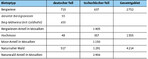 Der potenzielle Holzzuwachs in den deutschen Wäldern wurde anhand der sächsischen Ertragstafeln (www.dsw2.de/ertragstafeln.html) für einzelne Baumarten ermittelt, aus denen für die Wälder in der Gebirgsregion die schwächere Standortklasse zur Anwendung kam. Für die in der Biotopkartierung erfassten Hauptbaumarten wurden jeweils die Zuwachswerte aus den Wachstumstafeln entnommen, gemittelt und aufgerundet. Tab. 2 zeigt die angesetzten Werte, wobei im Falle von Biotopkomplexen die Hauptbaumarten der beteiligten Typen berücksichtigt wurden (Kürzel mit Bindestrich in linker Tabellenspalte).