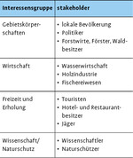 Die Komplexität lokaler Interessenskonstellationen erfordert eine genaue Ermittlung der Ursachen von Akzeptanzproblemen. Um einzelne Nutzungsansprüche und damit verbundene potentielle Akzeptanzdefizite zu eruieren, wurde im Rahmen einer qualitativ-empirischen, explorativen Studie (die Stichprobenzahl betrug 46) zunächst die Akzeptanz für ausgewählte, bereits in der Umsetzung befindliche Moorschutzmaßnahmen (Tab. 1) im Hinblick auf stakeholder (Tab. 2) untersucht. Zu diesem Zweck wurde eigens für die lokalen Gegebenheiten ein Fragebogen konzipiert. Das Befragungskonzept basiert auf der Operationalisierung der Ökosystemleistungen der Bruchflächen in Form einer für die Befragung angepassten Präzisierung der umgesetzten Renaturierungsmaßnahmen.