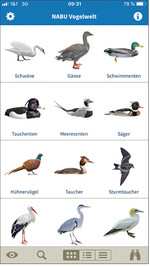 Der NABU stellt mit der Applikation „Vogelwelt“ eine umfangreiche Bestimmungshilfe für 308 Vogelarten zur Verfügung. Neben detaillierten Artporträts mit über 1 000 freigestellten Fotos, die über Aussehen, Häufigkeit, Verbreitung und Verhalten informieren, bietet die App für alle Arten auch europäische Verbreitungskarten und zeigt ähnliche Arten an. Bei der Bestimmung einzelner Arten hilft eine Suchfunktion, bei der mithilfe von Angaben zur Größe des Tieres, zum Habitat, in dem es gesichtet wurde, sowie mit verschiedenen Wahlmöglichkeiten zur Physiologie eine Auswahl möglicher Arten generiert wird.