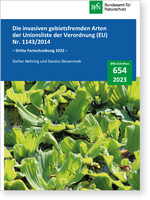 Für alle invasiven Arten sind Steckbriefe mit wesentlichen Angaben zum Vorkommen in Deutschland, zum Aussehen, zu Verwechslungsmöglichkeiten sowie mit allgemeinen Hinweisen zu möglichen Beseitigungs- und Kontrollmaßnahmen verfügbar. Zusätzlich wird jede Art mit charakteristischen Habitus- und Detailfotos sowie mit einer Verbreitungskarte mit vorhandenen Nachweisen in Deutschland vorgestellt. Neben einer umfangreichen Einführung zur EU-Verordnung sind als Anhang wichtige Dokumente zur EU-Verordnung vorhanden. Die BfN-Schrift 654 „Die invasiven gebietsfremden Arten der Unionsliste der Verordnung (EU) Nr. 1143/2014 – Dritte Fortschreibung 2022“ mit den Steckbriefen der 88 gelisteten Tier- und Pflanzenarten steht als PDF-Download...