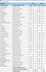 Insgesamt wurden innerhalb des Weidezauns 228 Pflanzenarten nachgewiesen (Ewald et al. 2018). Mit 36–76 Arten pro 100 m² waren die fünf ausgezäunten Langzeituntersuchungsflächen bemerkenswert artenreich und deckten mit insgesamt 145 Arten 64 % der Gesamtartenzahl innerhalb des Weidezauns ab. Dabei machen diese fünf Dauerbeobachtungsflächen (in der Summe 500 m²) nur 1,25 % der 4 ha Almfläche aus. Die häufigsten Arten waren die der Mähwiesen (Dactylis glomerata, Trollius europaeus, Cirsium oleraceum ), des Bergwaldes (Listera ovata, Primula elatior, Carex flacca ) und der subalpinen Rostseggenhalden (Carex ferruginea, Astrantia major, Lotus corniculatus, Pimpinella major ). Innerhalb der 228 Arten waren drei Baumarten, 18 Sträucher und Zwergsträucher, 41 Grasartige, acht Leguminosen und 158 krautige Arten (Abb. 6).