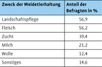 Der Hauptzweck der Nutztierhaltung liegt bei mehr als 50 % der Befragten gleichermaßen in der Fleischproduktion als auch in der Landschaftspflege. Die Anzahl der Teilnehmer, die Wolle produzieren, ist dagegen mit einem Anteil von 12,4 % gering (Tab. 4).