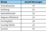 Von den 78 Befragten, die angaben, Landschaftspflege zu betreiben, machten 67 Angaben zu den Lebensräumen. Die Weideflächen betrafen vor allem Streuobstwiesen, Steilhänge und Wacholderheiden (LRT 5130) oder mageres Offenland (LRT 6210) (Tab. 5).