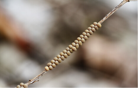 94 % der gefundenen Gelege waren an trockenen Stängeln überjähriger Vegetation abgelegt, durchschnittlich in 17 cm Höhe direkt über einem wärmeabstrahlenden Untergrund. In 38 % der Fälle konnte nach Erstfund eines Geleges mindestens ein weiteres Gelege innerhalb der dann näher untersuchten m²-Fläche gefunden werden und in 23 % der Fälle sogar am selben Pflanzenstängel, was die starke Selektion der Weibchen bezüglich der Auswahl der Eiablagestellen unterstreicht.