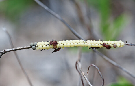 Insgesamt konnten 356 Eigelege vonL. coccajus gefunden werden, 153 davon in den 80 detailliert erfassten m²-Testflächen. In einigen Gebieten mit geringer Imaginaldichte konnte kein Gelegenachweis erbracht werden, während in anderen Gebieten mehr Eigelege als Imagines gezählt wurden.