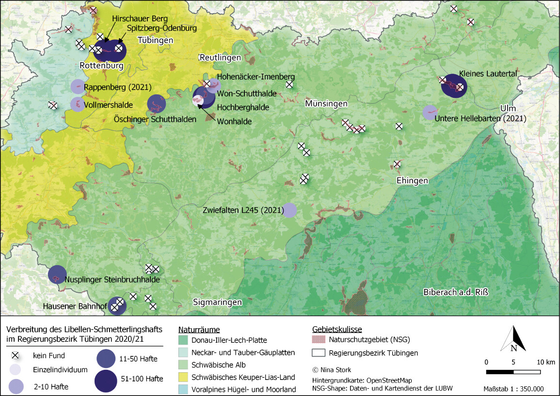 Der Libellen-Schmetterlingshaft besitzt im Untersuchungsraum wenige Schwerpunktvorkommen, in denen er alljährlich und individuenreich nachgewiesen werden kann (2021 konnte ein weiteres, in der Verbreitungskarte dargestelltes Schwerpunktvorkommen im Raum Zwiefalten nach Hinweisen von Dr. Hendrik Turni erfasst werden). Diese Schwerpunktvorkommen befinden sich räumlich voneinander getrennt in verschiedenen Naturräumen (Abb. 5):