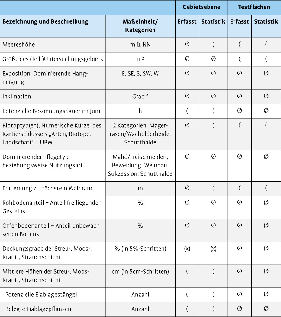 Numerische Prädiktoren umfassten die Inklination, die Dauer direkter Sonneneinstrahlung, die Deckungsgrade von Offenboden, Streu- und Krautschicht (jeweils log10-transformiert), die Höhe der Krautschicht sowie die Anzahl an Stängeln, die potenziell als Eiablagesubstrat dienen können (log10-transformiert). Zudem wurden die Anwesenheit von Sträuchern im Plot sowie die Exposition des Plots (Ost/Südost, Süd, Südwest) als kategorische Prädiktoren in das Modell übernommen.