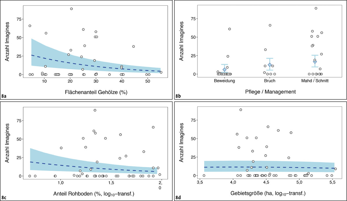Ein relevanter Rohbodenanteil von meist > 10 % war eines der Auswahlkriterien für die bearbeiteten Untersuchungsgebiete – über diesen Anteil hinaus konnte keine Assoziation der Individuenzahlen mit diesem Parameter ermittelt werden (Abb. 8 c). Gleiches galt für die Gebietsgröße (Abb. 8 d).