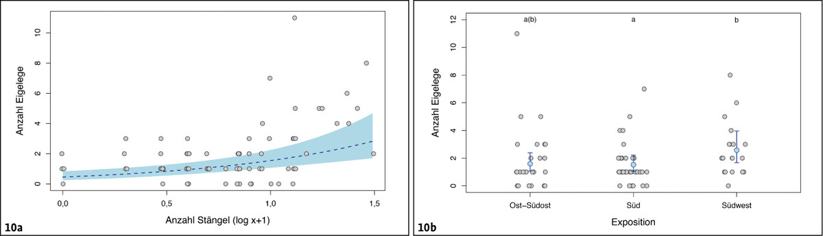 Von den zehn untersuchten Habitatparametern erreichten lediglich zwei statistische Signifikanz (für alle anderen: GLM chi² < 2,21 und P > 0,13). Die mittlere Anzahl an Eigelegen pro m² verdreifachte sich im Schnitt bei einer Zunahme der Anzahl vertrockneter Pflanzenstängel um den Faktor 10 (chi² = 12,99, df = 1, P = 0,0003, 95 % Konfidenzintervall 70–480 %, Abb. 10 a).