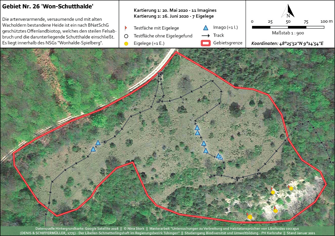 Gegen Ende der Flugzeit wurden Gebiete mit Nachweisen von Imagines zwischen dem 08.06. und dem 26.06.2020 zur Erfassung von Eigelegen erneut begangen. Eine wiederholte Kartierung der Gebiete ohne Imaginalnachweis konnte aus Zeitgründen nicht geleistet werden. Bei der Kartierung der Eigelege stand keine vollständige Erfassung des jeweiligen Kartiergebiets im Vordergrund, sondern eine qualitative Analyse bevorzugter Eiablagestellen. Hierfür wurden auf Literaturbasis (etwa Wolf 2004) Mikrohabitatparameter definiert, die in 1 × 1 m² großen Testflächen erhoben wurden (Tab. 1).
