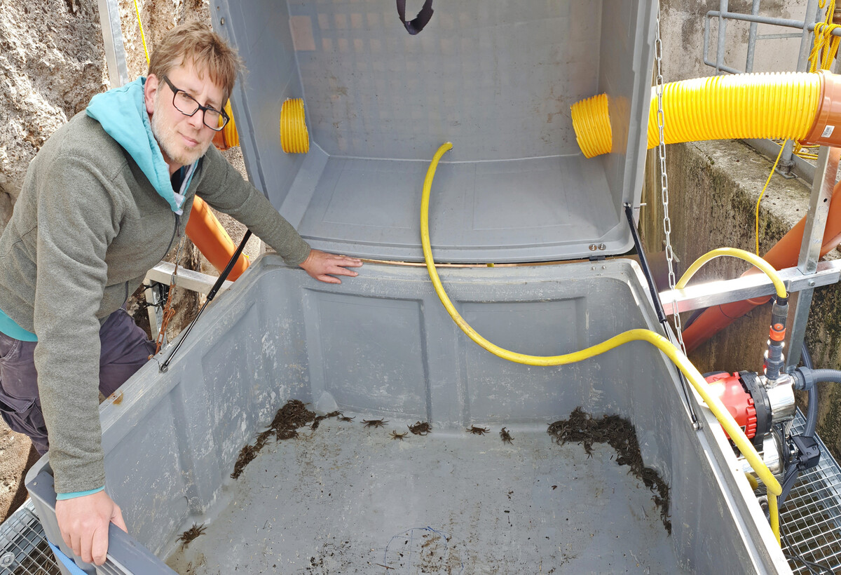 Die Bekämpfung der Krabbe selbst ist ein weiteres wesentliches Projektziel. Es gilt dabei, die in Belgien entwickelte Falle in weiteren Flusssystemen zu testen – in Deutschland beispielsweise in der Weser. „Wir nutzen dabei vorhandene Infrastruktur, konkret die Fischtreppen des Weserwehrs in Bremen“, erklärt Björn Suckow. „Das ist günstiger, wir haben weniger Eingriffe in die Natur und es ist bei großen Flüssen, die nicht über ihre gesamte Breite mit einer Falle bestückt werden können, die effektivste Möglichkeit.“