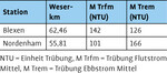Das WSA Weser-Jade-Nordsee misst an verschiedenen Pegeln in der Weser die Flut- und Ebbestrommittel der Trübung. Dem Zulauf zum Tidepolder am nächsten sind die beiden Pegelstandorte Blexen (Weser-km 62,46) und Nordenham (Weser-km 55,81). Die Mittelwerte der Flut- und Ebbestrommittel der Trübung an diesen beiden Pegeln sind in Tab. 1 dargestellt. In einer von der Bundesanstalt für Wasserbau herausgegebenen Untersuchung (BAW 2018) wurde folgende Formel zur Umrechnung von Trübung auf Schwebstoffkonzentration bestimmt: c (mg/l) = 3,89 × TR(NTU)0,83. Damit ergibt sich für den Tidepolder, bei einem mittleren Trübungswert um 130 NTU, eine Schwebstoffkonzentration von 221 mg/l. Es ist jedoch der modellhafte Ansatz der Formel und der Messungen zu berücksichtigen, sodass dieser Wert als Orientierungswert anzusehen ist (WSA 2021).