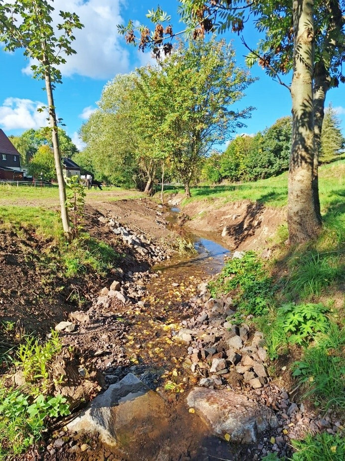 von DVL-Landesverband Sachsen e. V. erschienen am 14.01.2026Durch die Initiative des Fachberaters Gewässer (FBG) des Landesamtes für Umwelt, Landwirtschaft und Geologie (LfULG) konnten die Gemeinde und der Eigentümer der Fläche - die örtliche Kirchgemeinde – dafür gewonnen werden, einer Entwicklung des Gewässerabschnitts zuzustimmen. Entsprechend der Zuständigkeit übernahm der BGU die weitere Betreuung des Projektes.