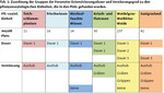 Die Zuordnung der pflanzensoziologischen Einheiten zu den Flächen (Tab. 1) zeigt, dass die Gruppen Aushub und Dauer 1 Plots mit allen sechs Einheiten haben und außerdem die einzigen Grupppen sind, auf denen Schlammpioniere und Frischwiesen vorkommen. Gräben und Keine haben Plots mit drei Gesellschaften, Grüppen, Dauer 2 und 3 haben nur Plots der Weidelgras-Weißkleeweiden und Saatgrasland.