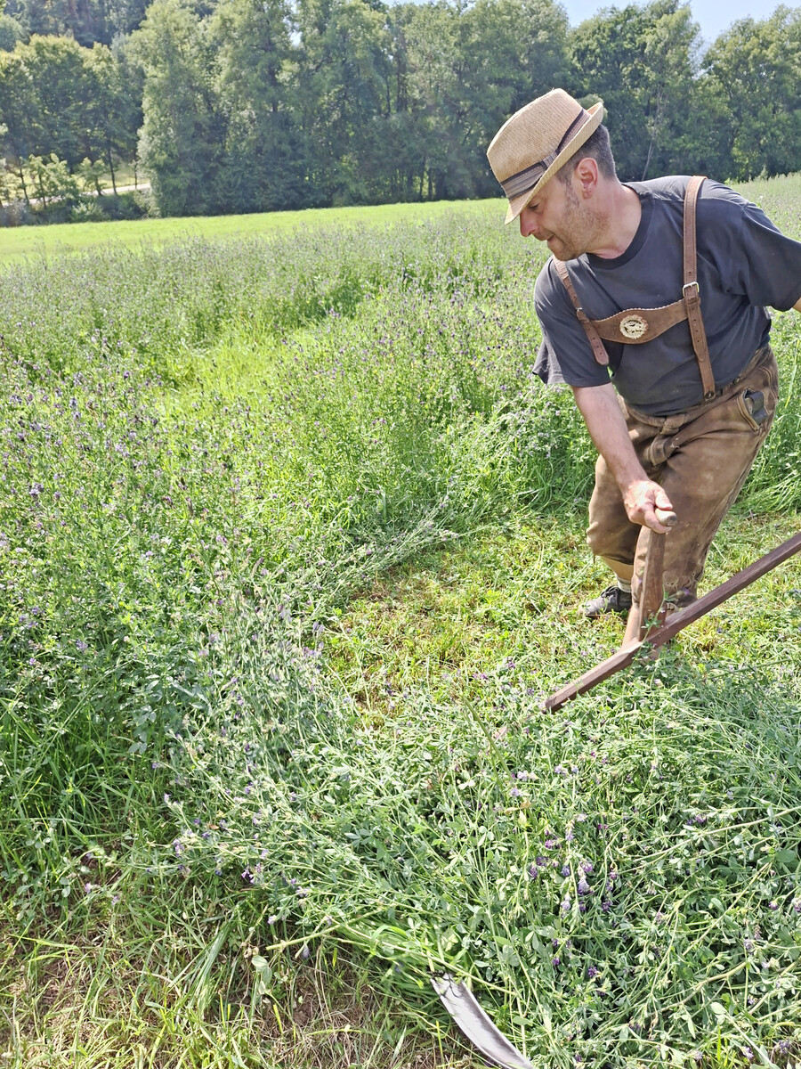 Vor der Einführung von Messerbalken- und später Rotationsmähwerken wurden Wiesen mit der Sense gemäht. Heute ist die Sense nur mehr eine Option der Biotoppflege (Poschlod 2015). Die Tagesleistung pro Arbeitskraft lag bei der Sensenarbeit selbst bei idealen Bedingungen kaum über 0,5 ha. Dieselbe Flächenleistung wird mit modernen Maschinen und entsprechender Arbeitsbreite heute oft in unter fünf Minuten bewältigt. Ein entscheidender Unterschied zwischen üblichen Mähwerken und Sense ist, dass die Sensenmahd eine niedrigere Schnitthöhe aufweist. Diese liegt bei der Sense nur knapp über der Bodenoberfläche, nämlich zwischen 1 und 1,5 cm (H. Winkels, Sensenverein Deutschland e.V., 2025 mündliche Mitteilung; vergleiche Oppermann & Claßen 1998; Abb. 1). Infobox 1 geht detaillierter auf die Sensenmahd, ihre Arbeitshöhe und die heutigen Einsatzoptionen ein.