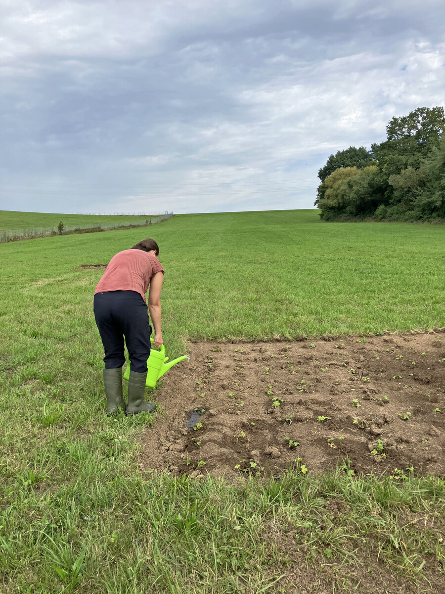 Um den jungen Pflanzen die besten Startbedingungen zu bieten, wurde an den Pflanzstandorten per Bagger der Oberboden auf 10 cm Höhe abgezogen. Dieses Abplaggen soll den Konkurrenzdruck durch andere Pflanzen minimieren. Der Offenboden birgt durch die fehlende Vegetationsschicht allerdings eine erhöhte Austrocknungsgefahr, weshalb die Setzlinge während der trockenen Spätsommertage gegossen werden mussten. Übernommen wurde die Arbeit von örtlichen Landwirten und dem LEV-Team, genutzt wurde wo möglich Wasser aus Oberflächengewässern der Umgebung.