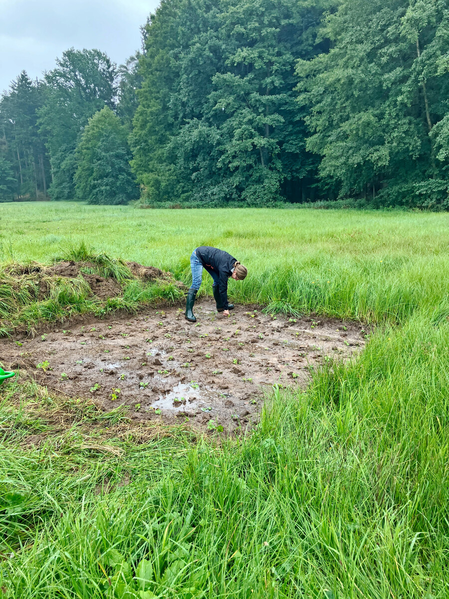 Bei Aussatversuchen über Einsaatstreifen konnte bisher kein Wuchserfolg dokumentiert werden, die Flächen werden aber weiterhin beobachtet. Bereits im Jahr 2023 wurden kleine Stückzahlen an Trollblumen auf abgeplaggten Flächen von 50 x 50 cm gepflanzt. Leider konnte bisher kein Anwachserfolg belegt werden. Als Konsequenz auf die offensichtlich durch Konkurrenzdruck missglückten ersten Versuche und die spontane Möglichkeit, eine große Anzahl an Setzlingen zur Verfügung gestellt zu bekommen, wurden die abgeplaggten Pflanzquadrate auf 3 x 3 m hochskaliert und die Zahl der Pflanzen je Standort auf 100 bzw. 50 gesetzt. Für Ex-Situ-Ansiedelungen wird auch in der Literatur eine Pflanzenzahl von mindestens 50 je Standort empfohlen, um negative Zufallsereignisse zu minimieren (Lauterbach 2013).