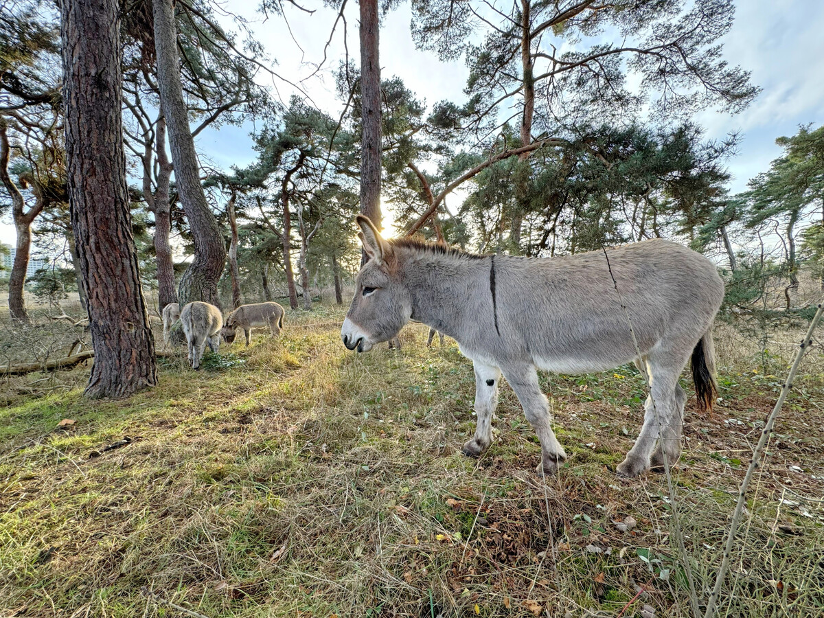 Im Gegensatz zu den Schafen können die weniger selektiv grasenden Rinder, Pferde und Esel die Aufrechte Trespe auch während der Sommermonate wirksam zurückdrängen und dadurch konkurrenzschwächeren Zielarten Raum verschaffen (Bunzel-Drüke et al. 2008). Als besonders geeignet für die Pflege der Federgras-Steppe erweist sich eine Winterbeweidung mit diesen Raufutterfressern. Da die abgestorbene Biomasse in dieser Jahreszeit einen geringeren Nährstoffgehalt aufweist, kommen hierfür lediglich anspruchslose Arten bzw. Rassen infrage. Esel zeigen sich dabei als besonders geeignet: Sie fressen im Winter nicht nur die dann photosynthetisch aktive Aufrechte Trespe, sondern auch den abgestorbenen Stipa-Aufwuchs sowie nahezu alle Gehölze – und dies ohne Zufütterung (Zehm et al. 2015). Der Pflegezustand der Federgras-Steppe des Mainzer Sandes konnte in den letzten Jahren durch eine etwa dreimonatige Winterbeweidung mit einer rund 20 Tiere umfassenden Eselherde in großflächiger Koppelhaltung deutlich verbessert werden (Becker et al. 2025, s. auch Süß 2006) (Abb. 5).