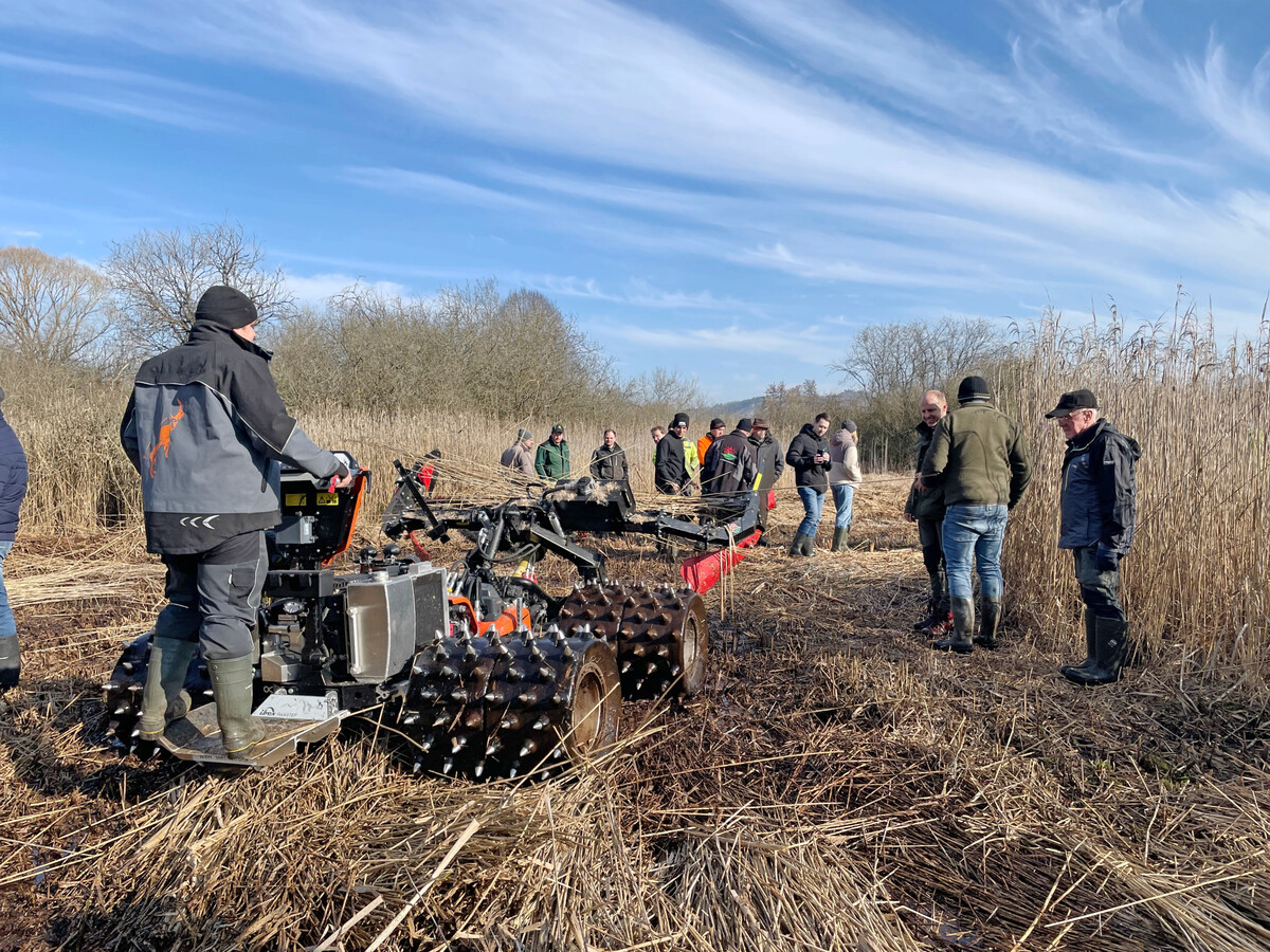 Die Firmen TerraTec aus dem Vorarlberg und BB-Umwelttechnik aus dem Allgäu tüfteln ständig nach neuen Lösungen für besonders bodenschonende und naturverträgliche Mahd auf Spezialflächen. Der TerraTec-Steinbock (Ibex) wurde für die Bewirtschaftung von Steilhängen konzipiert, kristallisierte sich wegen seiner besonders leichten Bauweise und der breiten Reifen als ebenso geeignet für durchnässte Moorflächen heraus. Aufgrund der Dornen an den Reifen können sie sich effizient antreiben, der Fahrer kann sich direkt aufs Gerät stellen und muss nicht, wie bei vielen anderen Balkenmähern, hinterherlaufen. Beeindruckt waren die Teilnehmerinnen und Teilnehmer auch von der Präzision, mit der die Anbaugeräte der Firma BB-Umwelttechnik das Schilf geschnitten und von der Fläche geborgen haben.